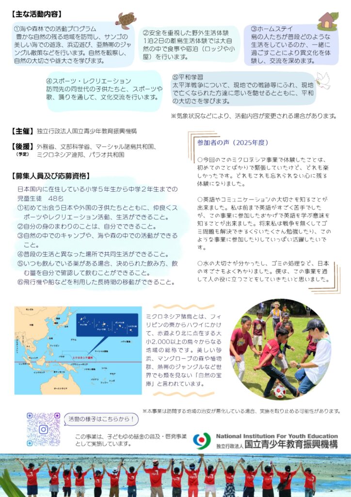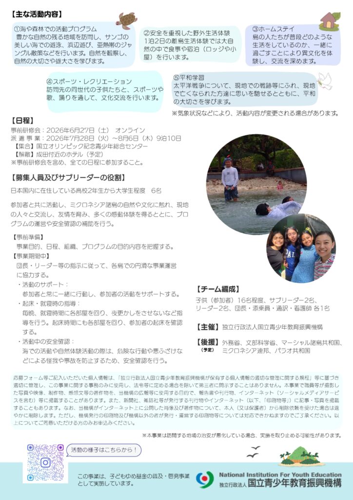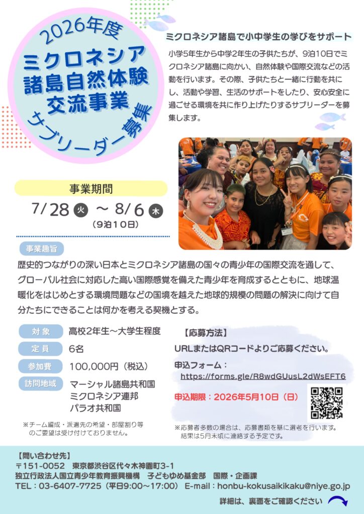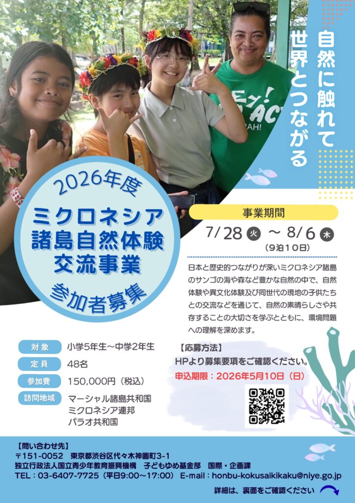 国立青少年教育振興機構が「ミクロネシア諸島自然体験交流事業」の参加者(小5~中2)とサブリーダー(高2~大学生)募集を開始しました!